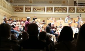 Obwohl nur wenige Meter zwischen den beiden Stationen des Tages lagen, erlebten wir ein komplettes Kontrastprogramm. Zunächst besuchten wir das Konzerthaus am Gendarmenmarkt. Wir betraten es allerdings durch den Künstlereingang in der Charlottenstraße. Da im Großen Saal bereits die Probe für die Konzerte am Wochenende lief, mussten wir sehr leise durch die zahlreichen Flure und über die Treppen schleichen. Schon der Beethoven-Saal war beeindruckend. In einer digitalen Ausstellung erfuhren wir Details u. a. über die Geschichte des Hauses, die Orchesterinstrumente und sahen Ausschnitte aus Konzerten. Anschließend konnten wir an einer öffentlichen Probe teilnehmen. Für viele von uns war es ein erstaunliches Erlebnis, im überwältigenden Großen Saal zu sitzen, und den Musikern und Musikerinnenzu lauschen, die sich mit dem Schauspieler Tobias Moretti und dem Dirigenten Bertrand de Billy auf die Aufführungen der nächsten drei Tage vorbereiteten.