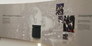 Nach einer Mittagspause besuchten wir den Deutschen Dom. Dort zeigt der Deutsche Bundestag eine Ausstellung zum Parlamentarismus in Deutschland. Empfangen wurden wir in einer Miniversion des Plenarsaals des Deutschen Bundestages. Dort konnten wir unsere Kenntnisse aus dem Politikunterricht beweisen. In sechs Kleingruppen erkundeten wir dann die Ausstellung mit ihren vielfältigen digitalen Angeboten. Die Gruppen fanden mehr oder weniger komplexe Antworten auf die von ihnen zu bearbeitenden Fragen. Anschließend sollten wir die Ergebnisse der Gruppenarbeit präsentieren. Nicht jede/r traute sich dabei auch ans Rednerpult. Mit neuen Informationen und interessanten Eindrücken verabschiedeten wir uns am Nachmittag.