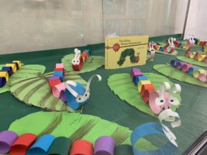 Die Klasse 4/1 las im Rahmen des Kunstunterrichts die bekannte Geschichte „Die kleine Raupe Nimmersatt“ von Eric Carle. Anschließend haben alle Schülerinnen und Schüler mit Unterstützung der Elternsprecherinnen Frau Hassan und Frau Spindler wunderschöne Raupen gebastelt. Schneiden, Messen und Kleben – allen Schülerinnen und Schülern hat es viel Spaß gemacht. Die Kunstwerke sind nun im Schaukasten im Erdgeschoss vor dem Kunstraum ausgestellt.