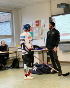 Am 07. Januar 2020 hatten wir, die Klasse 9/4, einen besonderen Gast im Englisch Unterricht. Auf Einladung unserer Lehrer hat uns der Eishockeyspieler Landon Ferraro besucht. Landon Ferraro spielt seit kurzem bei den Berliner Eisbären. Da er ursprünglich aus Kanada kommt und noch nicht lange in Berlin ist, konnten wir uns nur auf Englisch mit ihm unterhalten. Das war zwar auch ein bisschen schwierig, aber vor allem sehr spannend. Wir konnten ihm alle Fragen stellen, die uns interessiert haben: Zum Beispiel wie das bei ihm mit dem Eishockey angefangen hat, wo auf der Welt er schon gespielt hat, welche Verletzungen er schon hatte und wie es ihm in Berlin gefällt. Am Ende durfte einer von uns sogar seine Ausrüstung anprobieren.