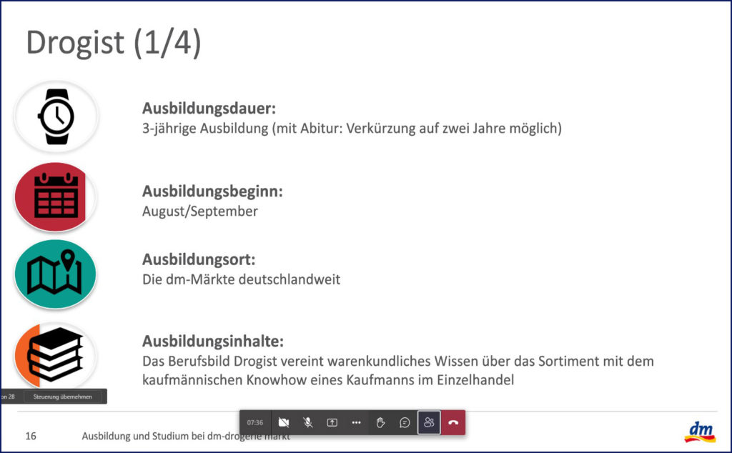 Da die Unternehmen zurzeit nicht in der Schule sein können, haben wir diesmal ein virtuelles Angebot zusammengestellt und alle Schülerinnen und Schüler des 9. und 10. Jahrgangs hatten die Möglichkeit in der Zeit von 9.00 Uhr bis 16:00 Uhr die Unternehmen „online“ zu besuchen. Die Ausbildungsleitungen haben sich gemeinsam mit einigen Auszubildenden jeweils eine Stunde Zeit genommen, um unsere Schülerinnen und Schüler durch die Unternehmen zu führen, die Bewerbungsabläufe zu erklären und Fragen zu beantworten.