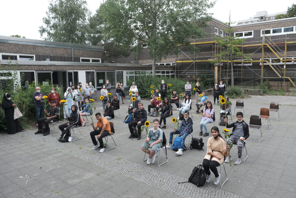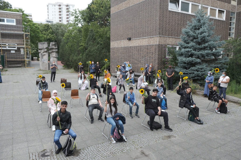 Am Montag den 09.08.2021 war es wieder so weit. Die Hermann-von-Helmholtz-Schule durfte ihren neuen Siebtklässlerinnen und -klässler willkommen heißen. Nach kurzer COVID-Kontrolle vor den Schultoren nahmen sie auf dem Pausenhof Platz. Im Sinne einer lebhaften und freudvollen Zeit für die kommenden Jahre begrüßte die Schule die 96 neuen Schüler und Schülerinnen und überreichte allen dazu eine Sonnenblume. Danach ging es in die Klassenzimmer. Hier erfolgte vor einer aufmerksamen Schülerschaft die Belehrung über Hausordnung und Corona-Regeln. Aber auch erste Kennenlernspiele wie „Litfaßsäule“ ermöglichten ein erstes „Herantasten“. Denn die Spannung war vielen Neuankömmlingen trotz Maskierung gut abzulesen. Aber auch die Lehrkräfte waren aufgeregt, ihre neuen Schützlinge kennen zu lernen.