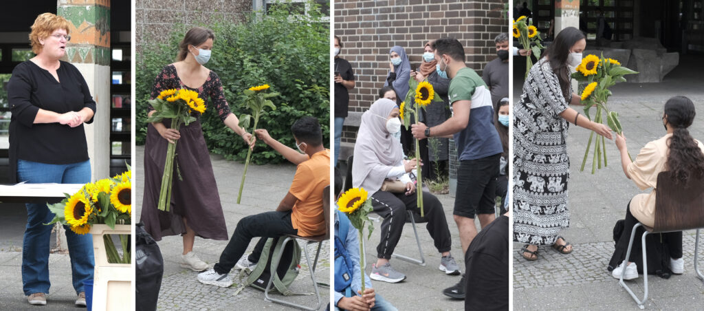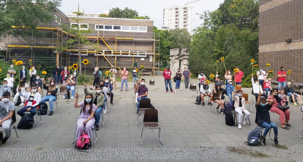 Am Montag den 09.08.2021 war es wieder so weit. Die Hermann-von-Helmholtz-Schule durfte ihren neuen Siebtklässlerinnen und -klässler willkommen heißen. Nach kurzer COVID-Kontrolle vor den Schultoren nahmen sie auf dem Pausenhof Platz. Im Sinne einer lebhaften und freudvollen Zeit für die kommenden Jahre begrüßte die Schule die 96 neuen Schüler und Schülerinnen und überreichte allen dazu eine Sonnenblume. Danach ging es in die Klassenzimmer. Hier erfolgte vor einer aufmerksamen Schülerschaft die Belehrung über Hausordnung und Corona-Regeln. Aber auch erste Kennenlernspiele wie „Litfaßsäule“ ermöglichten ein erstes „Herantasten“. Denn die Spannung war vielen Neuankömmlingen trotz Maskierung gut abzulesen. Aber auch die Lehrkräfte waren aufgeregt, ihre neuen Schützlinge kennen zu lernen.