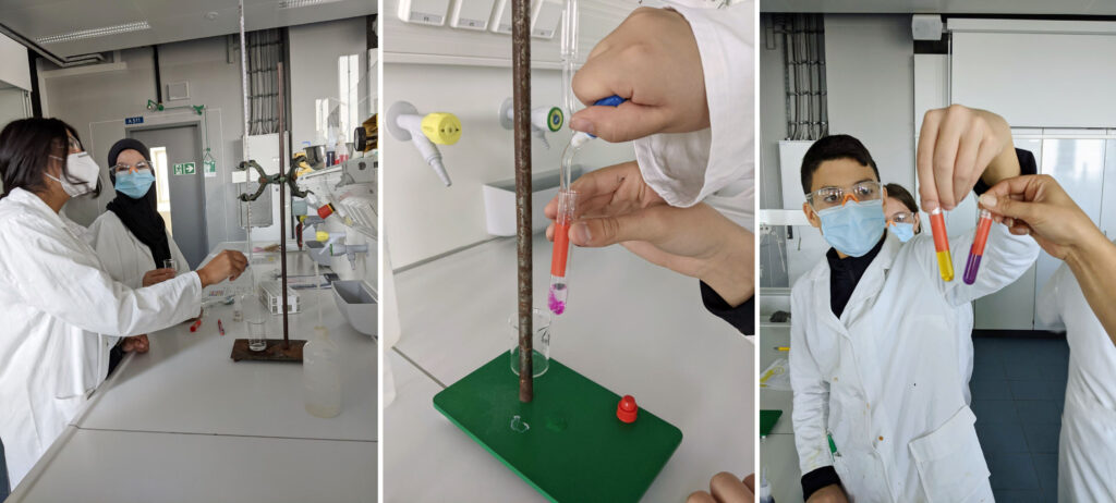 „Am 16.09.2021 ging der „Öko-Nat-Kurs“ (gemeinsam mit weiteren Schüler*innen des 10. Jahrgangs und der Willkommensklasse) der Hermann-von-Helmholtz-Schule in die Lise-Meitner-Schule. Wir hatten die Möglichkeit, die Schule und ihre Labore zu erkunden. Vor der Lise-Meitner-Schule wurden wir höflich empfangen und haben einen Laborkittel und eine Schutzbrille bekommen. Anschließend wurden wir in zwei Gruppen aufgeteilt und sind dann in die Labore gegangen. In dem Labor haben wir zwei Versuche durchgeführt. Im ersten Versuch ging es darum unbekannte Indikatoren zu bestimmen. Es stellte sich heraus, dass es sich um die Indikatoren Methyl-Orange, Phenolphthalein, Lackmus und Bromthymolblau handelte. Bei dem zweiten Versuch mussten wir den Calciumgehalt von Milch bestimmen. Dies gelang uns mit Hilfe von 0.05 ml EDTA-Lösung, 90 ml destilliertem Wasser, einer Spatelspitze Calconcarbonsäure (C21H14N2O7S) und Natriumhydroxid (NaOH). Mir persönlich hat dieser Tag sehr gefallen, da wir viel Neues gelernt haben und ich es sehr interessant fand die unbekannten Indikatoren zu bestimmen.“ (Selin M. / 10.2)