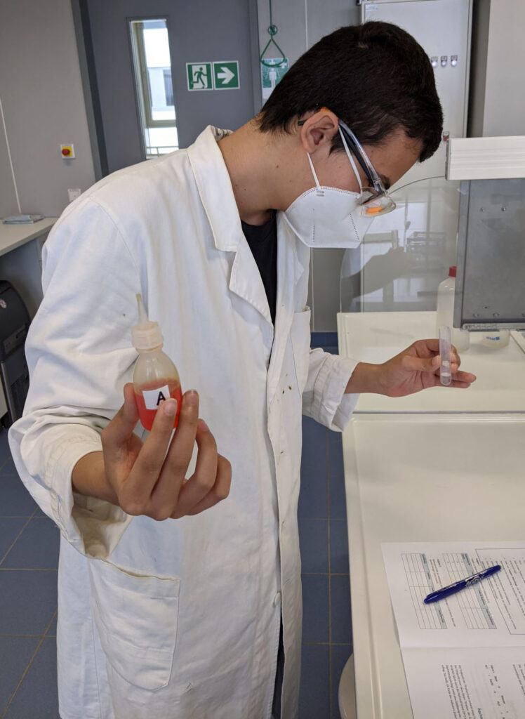 „Am 16.09.2021 ging der „Öko-Nat-Kurs“ (gemeinsam mit weiteren Schüler*innen des 10. Jahrgangs und der Willkommensklasse) der Hermann-von-Helmholtz-Schule in die Lise-Meitner-Schule. Wir hatten die Möglichkeit, die Schule und ihre Labore zu erkunden. Vor der Lise-Meitner-Schule wurden wir höflich empfangen und haben einen Laborkittel und eine Schutzbrille bekommen. Anschließend wurden wir in zwei Gruppen aufgeteilt und sind dann in die Labore gegangen. In dem Labor haben wir zwei Versuche durchgeführt. Im ersten Versuch ging es darum unbekannte Indikatoren zu bestimmen. Es stellte sich heraus, dass es sich um die Indikatoren Methyl-Orange, Phenolphthalein, Lackmus und Bromthymolblau handelte. Bei dem zweiten Versuch mussten wir den Calciumgehalt von Milch bestimmen. Dies gelang uns mit Hilfe von 0.05 ml EDTA-Lösung, 90 ml destilliertem Wasser, einer Spatelspitze Calconcarbonsäure (C21H14N2O7S) und Natriumhydroxid (NaOH). Mir persönlich hat dieser Tag sehr gefallen, da wir viel Neues gelernt haben und ich es sehr interessant fand die unbekannten Indikatoren zu bestimmen.“ (Selin M. / 10.2)