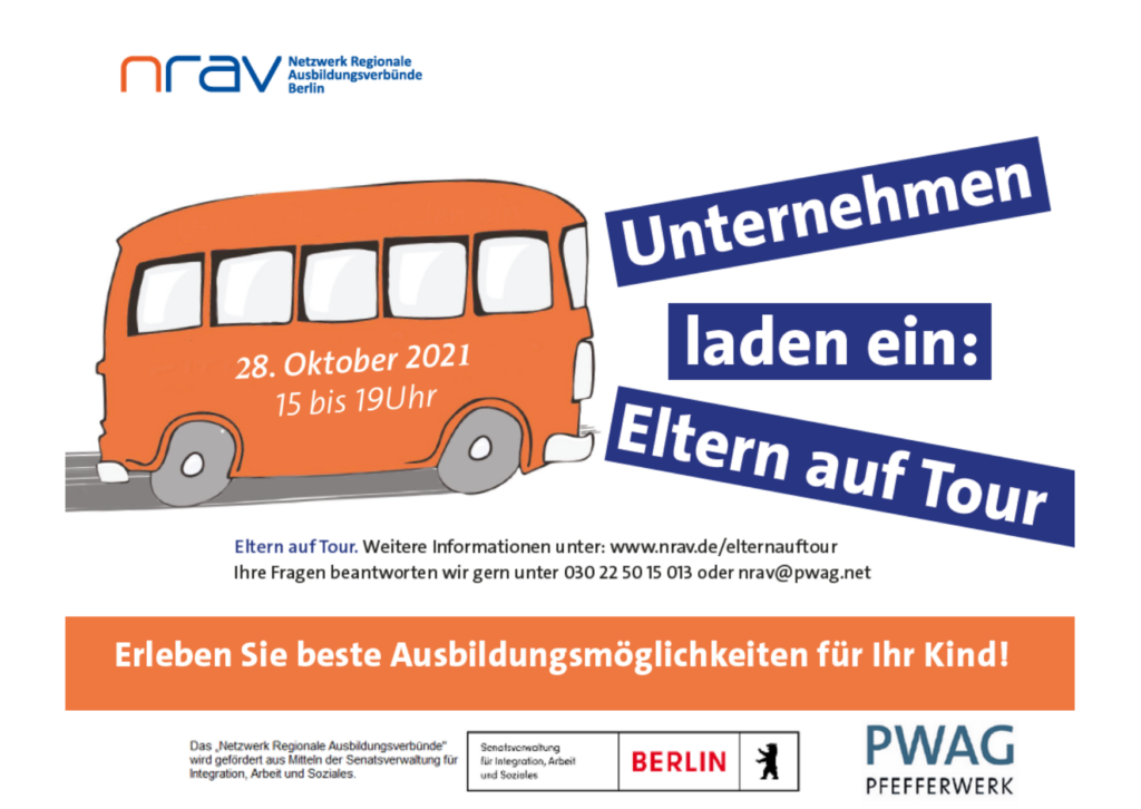 Unter dem Motto Eltern auf Tour – Unternehmen laden ein bietet das Berliner Netzwerk Regionale Ausbildungsverbünde interessierten Erziehungsberechtigten und ihren Kindern die Möglichkeit, ausbildende Unternehmen kennenzulernen und sich über die Angebote der dualen Ausbildung zu informieren.
