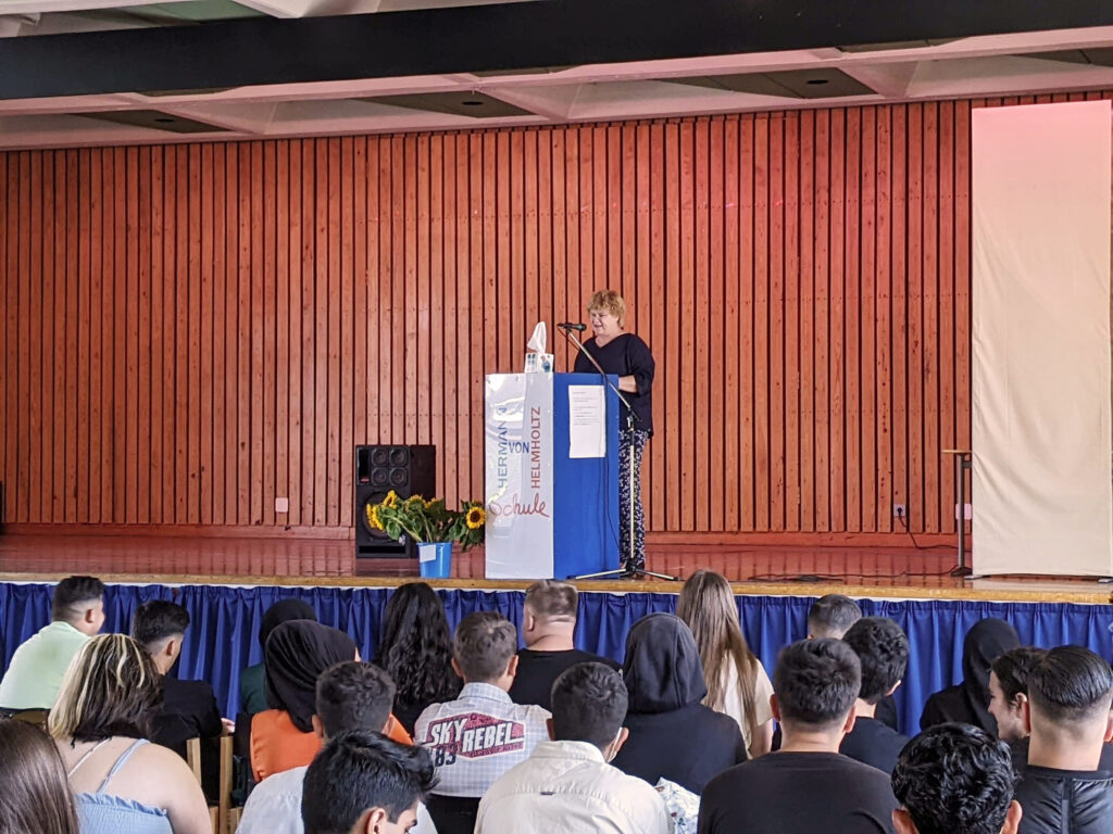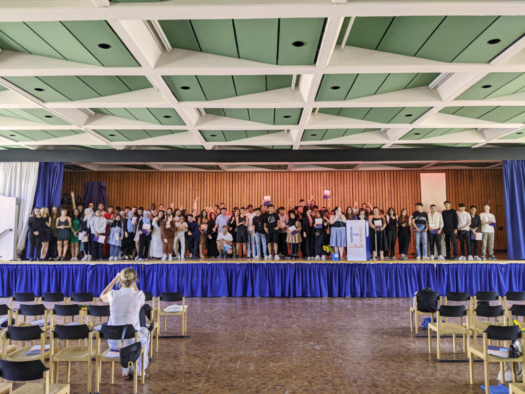 Nach warmen Worten unserer Schulleiterin Frau Fischler, die uns nochmal den historischen Kontext der pandemiegebeutelten Jahrgänge vor Augen führte, übernahmen schließlich die Klassenleitungen (10/1: Fr. Röder / Hr. Brandt, 10/2: Fr. Fries / Fr. Mischek, 10/3: Fr. Thrun / Hr. Müller, 10/4: Fr. Zobolski / Hr. Hildebrandt) und baten die Schülerinnen und Schüler auf unsere große Bühne der Aula, um feierlich die Hände zu schütteln.