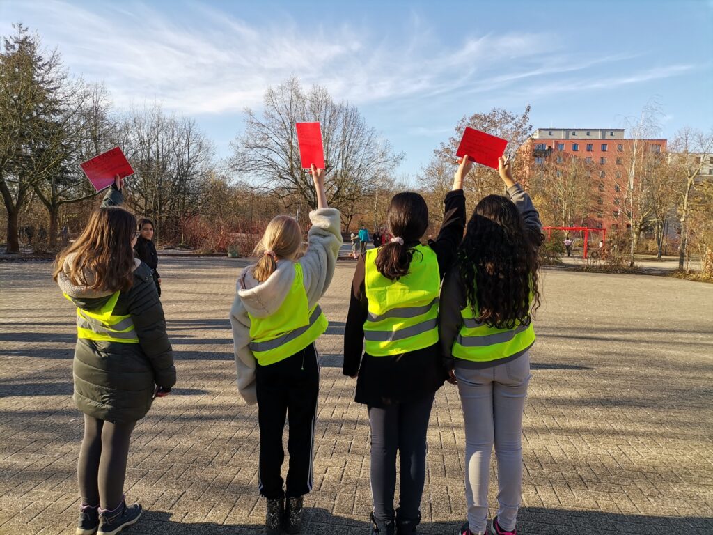 In einem zweitägigen Kompaktkurs wurden Fünft- und Sechstklässler und -klässler zu Streitschlichterinnen und -schlichtern ausgebildet. Mit großem Verantwortungsbewusstsein unterstützen sie nun die Pausenaufsichten auf dem Schulhof und vermitteln in Konflikten. Erkennbar sind sie an den gelben Warnwesten.