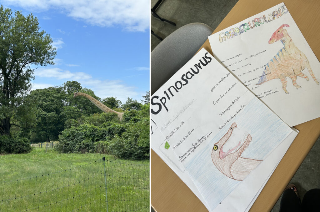 Am Montag den 03.07.23 waren wir, die Klasse 7.2 im Tierpark. Wir liefen durch den Tierpark, um Informationen über Dinosaurier zu sammeln. Dabei teilten wir in Vierergruppen auf und lernten sehr viele Dinosaurier kennen, wie z.B. den Tyrannosaurus-Rex, den Gigantosaurus, den Parasaurolophus und viele mehr. Es waren ganz unterschiedliche Dinosaurier zu sehen. Jeder Dinosaurier sah anders aus und hatte seine eigene Besonderheit. Der größte Dino war 12 Meter hoch und 25 Meter lang. Der schwerste Dino war der Patagotitan, der bis zu 80 Tonnen wog. Im Tierpark sahen wir aber auch ganz andere und ganz unterschiedliche Tiere: Vögel, Rehe, Affen und sogar Erdmännchen. Am Tag danach fertigten wir Steckbriefe über die Dinos an. Jeder hatte einen anderen Dino. Mir hat der Ausflug sehr gefallen.