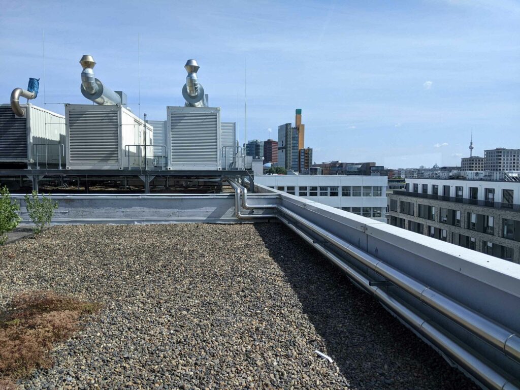 Nach einer kurzen Sicherheitsbelehrung ging es dann auf das Dach des Bürogebäudes und wir konnten neben dem großartigen Blick über den Dächern Berlins viel über redundante Klimageräte und Dieselgeneratoren erfahren.