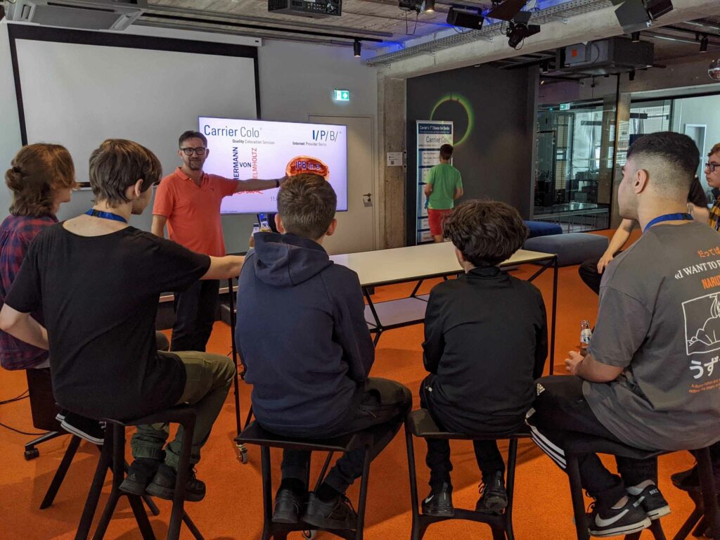 Dort wurden wir in den Räumen der I/P/B Internet Provider in Berlin GmbH von Jennifer Sainte-Luce und Birgit Schönborn sehr freundlich am Empfang begrüßt. Nach der Verteilung der Gästeausweise ging es nach einer kurzen Stärkung mit Obst, Keksen und Getränken in den „Konfi“. Dort wurden wir von Sven (wir waren schnell beim „Arbeits-Du“) darüber informiert, dass wir alle unsere Mobiltelefone im Raum lassen müssen und keine Fotos gemacht werden dürfen.