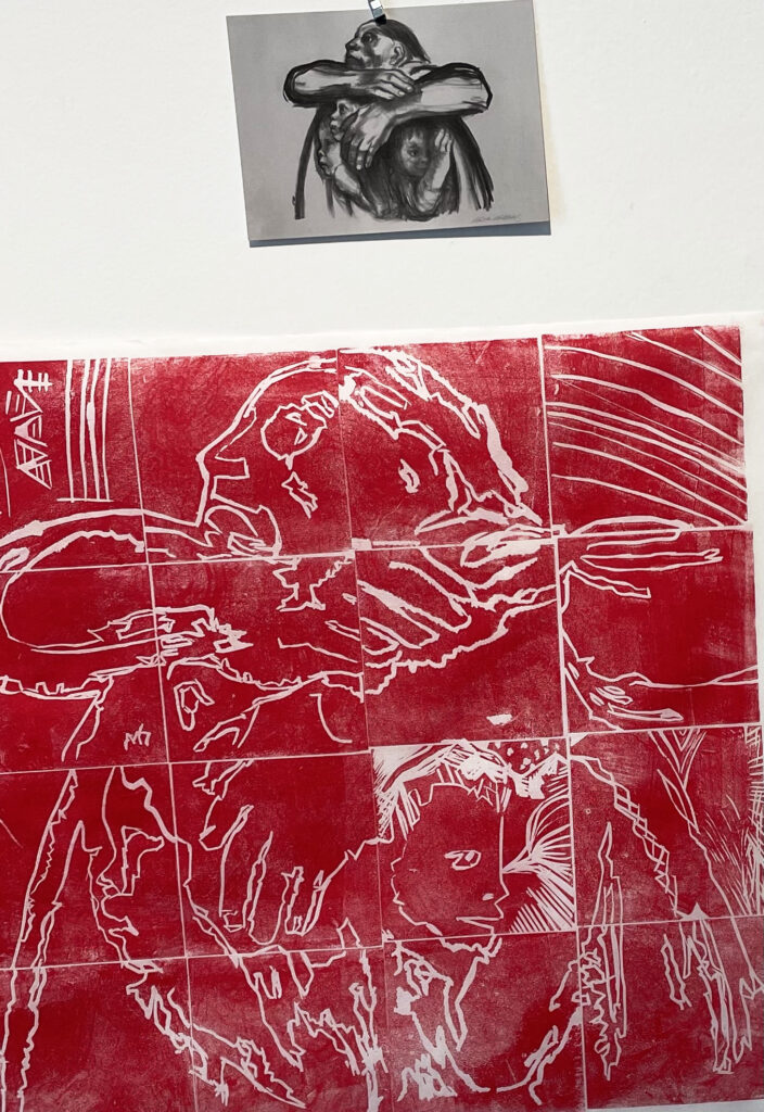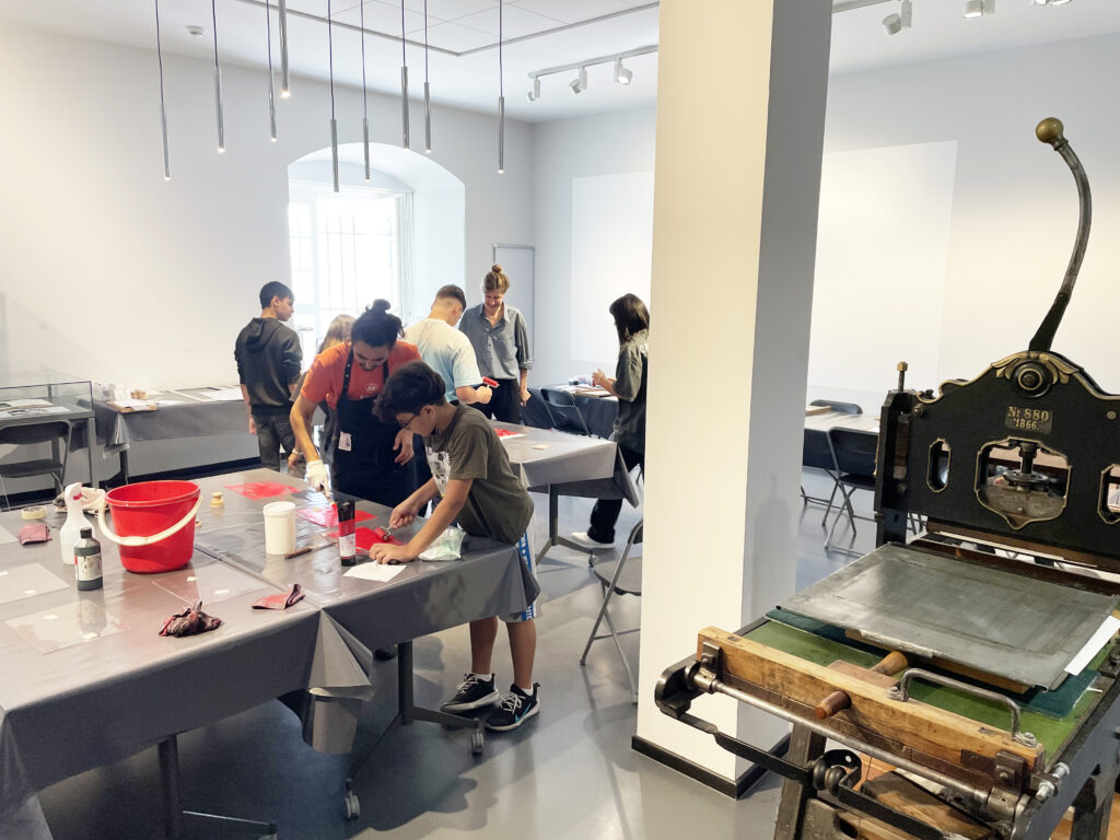 Im Anschluss stellte die Klasse gemeinsam eine eigene Variante eines ihrer Werke her. Mit viel Freude und Konzentration wurde dabei die Technik des Linolschnitts erprobt.