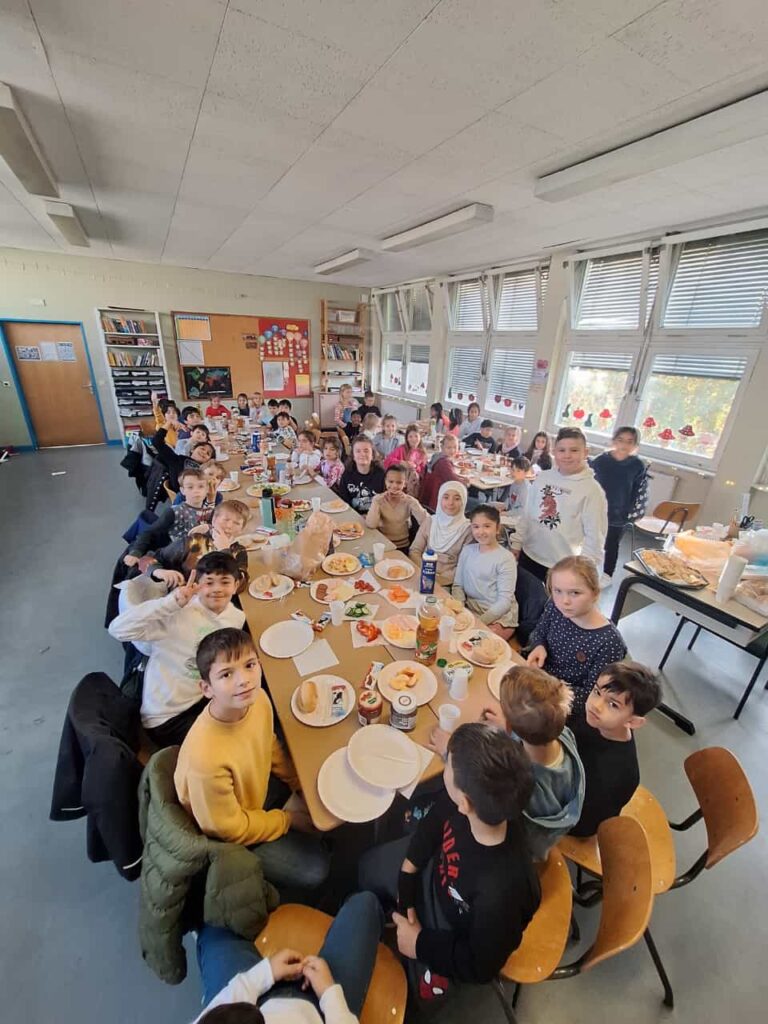 Das „Teilen mit anderen“ setzen einige der „Ersties“ am Freitag ganz praktisch selbst in die Tat um. Gemeinsam mit der Patenklasse wurde gefrühstückt und so das Essen geteilt!