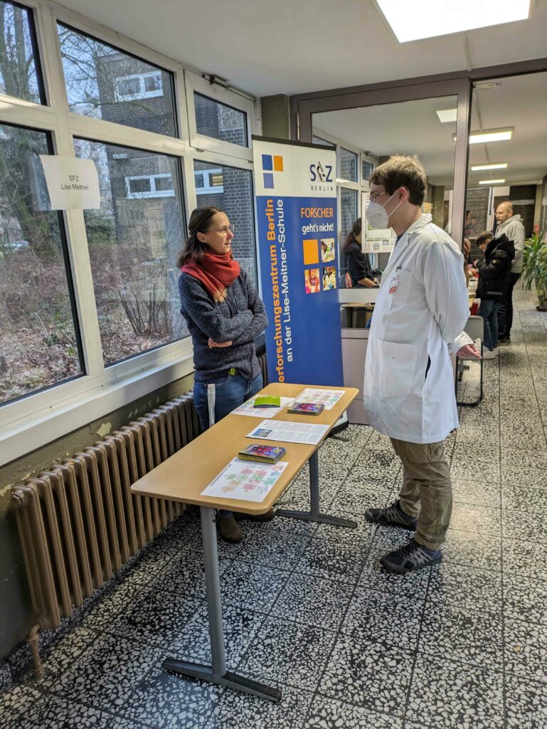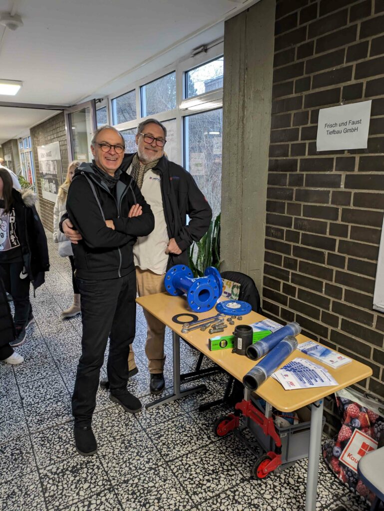 Das Schülerforschungszentrum an der Lise-Meitner-Schule nutzte die Möglichkeit, seine Angebote und die Kooperation mit unserer Schule vorzustellen. Zusätzlich könnten sich die Gäste beim Flanschen einer Rohrleitung am Stand unseres Partners Frisch und Faust Tiefbau GmbH ausprobieren.