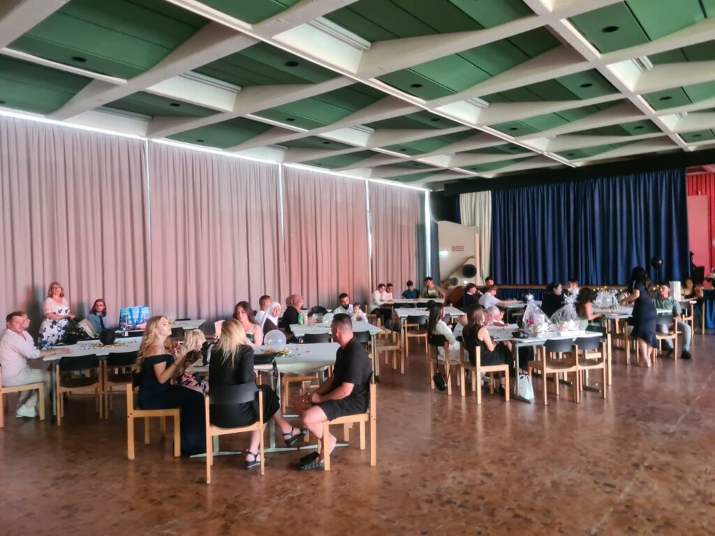 Am letzten Donnerstag (11.07.) fand dann die große Abschlussfeier statt. Schon Tage vorher wurde die Aula geputzt, hergerichtet und geschmückt. Das Festkomitee unter der Leitung von Frau Rust und Frau Burmeister hat wirklich ganze Arbeit geleistet. Pünktlich um 18 Uhr konnte die Party beginnen, es wurde gegessen, getanzt und gelacht.