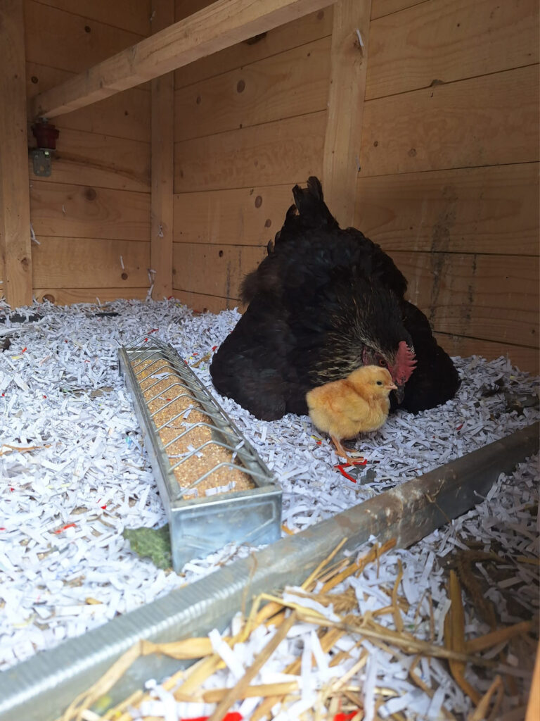 Fast pünktlich zum Schulstart hat es bei den Hühnern Nachwuchs gegeben. Am Sonntag, den 15.09., schlüpfte ein Küken und wird seitdem liebevoll von Yang (der großen, schwarzen Henne) umsorgt und beschützt. Ob es sich um eine Henne oder einen Hahn handelt, ist derzeit noch unklar, das können nur Experten am 1. Tag erkennen. So gut kennen wir uns leider noch nicht aus, darum warten wir entspannt ab, was sich aus dem süßen kleinen Küken entwickelt.