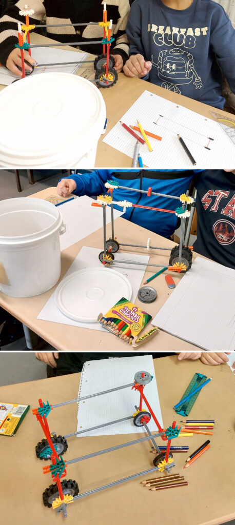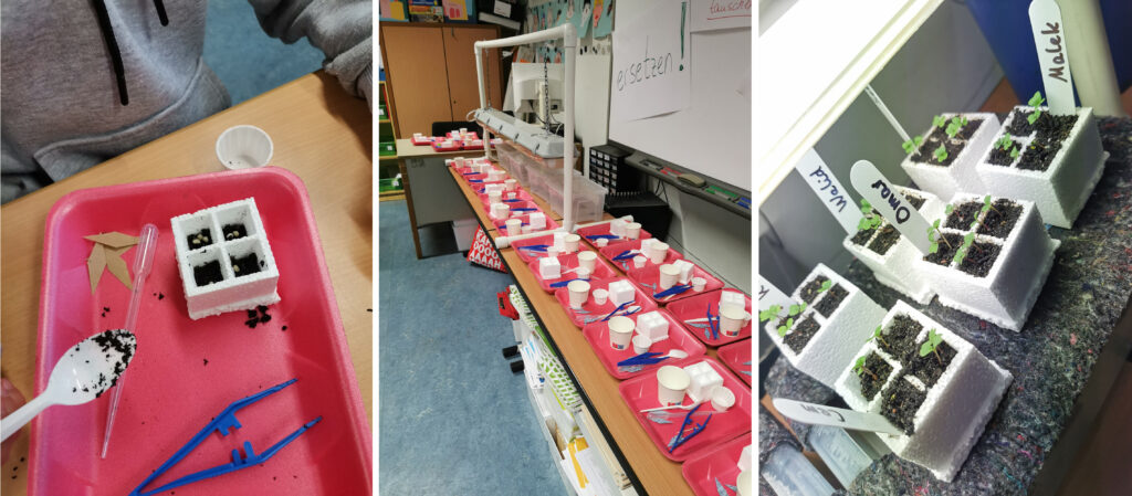 TuWas! stellt Lehrmaterial zu verschiedenen Experimentiereinheiten zur Verfügung: dazu wurden für die teilnehmenden Klassen große rosafarbene Kisten angeliefert, in denen alles für das naturwissenschaftliche Lernen der nächsten Wochen enthalten war – wie spannend war schon allein das! Dann verwandelten sich die Klassenzimmer in kleine Forscher­laboratorien: alles wurde ausgepackt und die Versuchseinheiten aufgebaut. Die Klasse 3/2 erforschte den Lebenszyklus einer Raps-Pflanze – von der Aussaat über das Pflanzenwachstum, das Blühen und Bestäuben bis hin zur Samenbildung und Ernte. Die Klasse 4/1 baute eigene Fahrzeuge und untersuchte den Zusammenhang von Konstruktion und Bewegung.