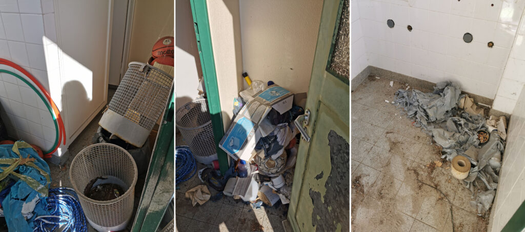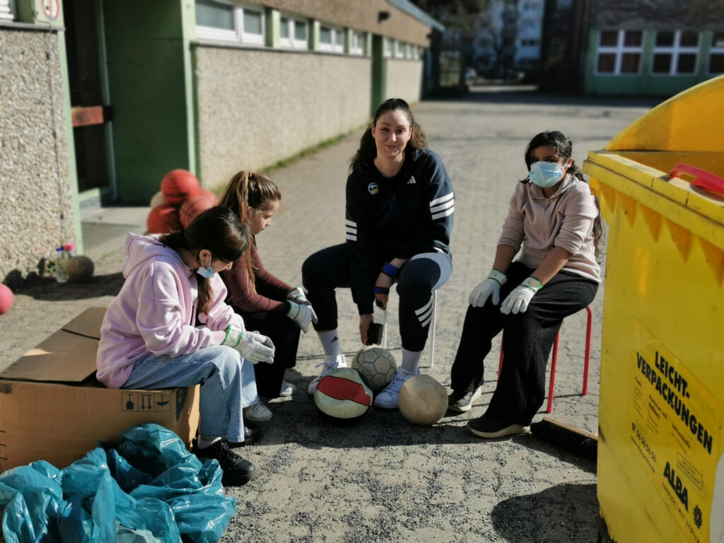 Im nächsten Schritt wurden zwei ehemalige Toilettenräume in der Sporthalle, die schon lange leer standen, entrümpelt und saubergemacht. Vor Staub und Dreck brauchte trotzdem keine/r Angst haben. Alle Kinder und Erwachsenen trugen Handschuhe und hatten eine Maske aufgesetzt. Der viele Müll kam direkt in die Tonne.