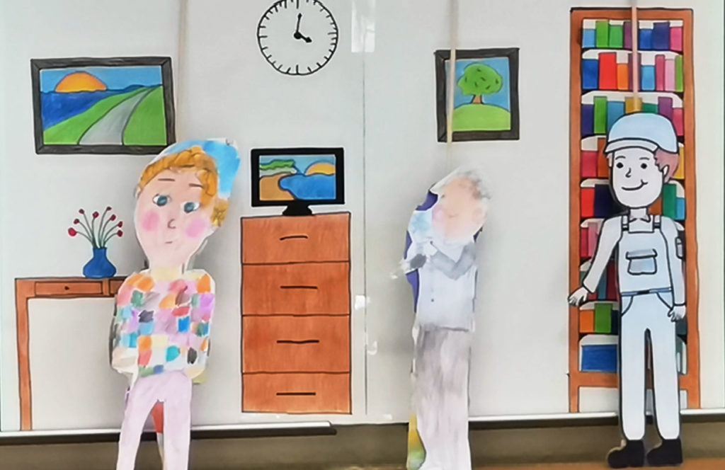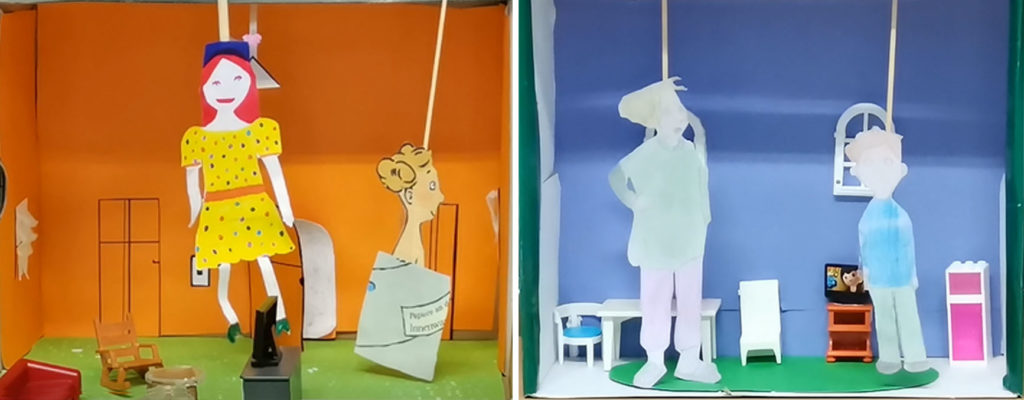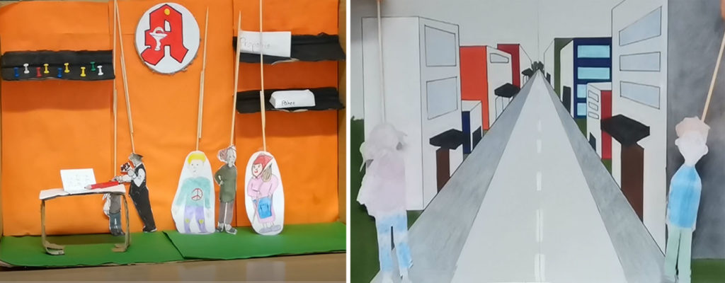 Danach hat die Klasse eine besondere Herausforderung angenommen – und hat das Buch als Papierpuppentheater umgesetzt! Die Klasse wurde in kleine Arbeitsgruppen geteilt und jede Gruppe hat kleine Szenen für das Spielen mit Papierpuppen vorbereitet. Die Gruppenarbeit lief dabei ausschließlich telefonisch und online! Rollen wurden verteilt, Texte am Telefon geübt und in Einzelarbeit Papierpuppen (an Holzstäben) und Kulissen gebastelt.